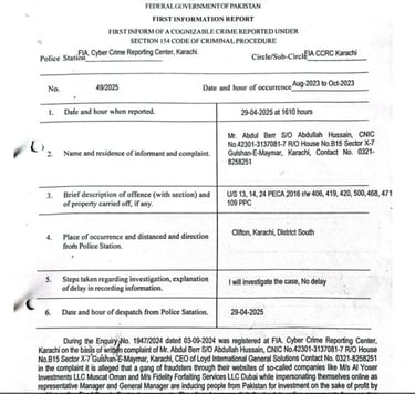 In response to the substantial financial and reputational damage caused by Amjad Ali, Faisal Raza, and their associated network, multiple legal actions have been initiated. FIRs have been registered across various jurisdictions in Pakistan, and formal complaints have been submitted to the Federal Investigation Agency (FIA) and authorities in the UAE, Qatar, Oman, and other Gulf countries.